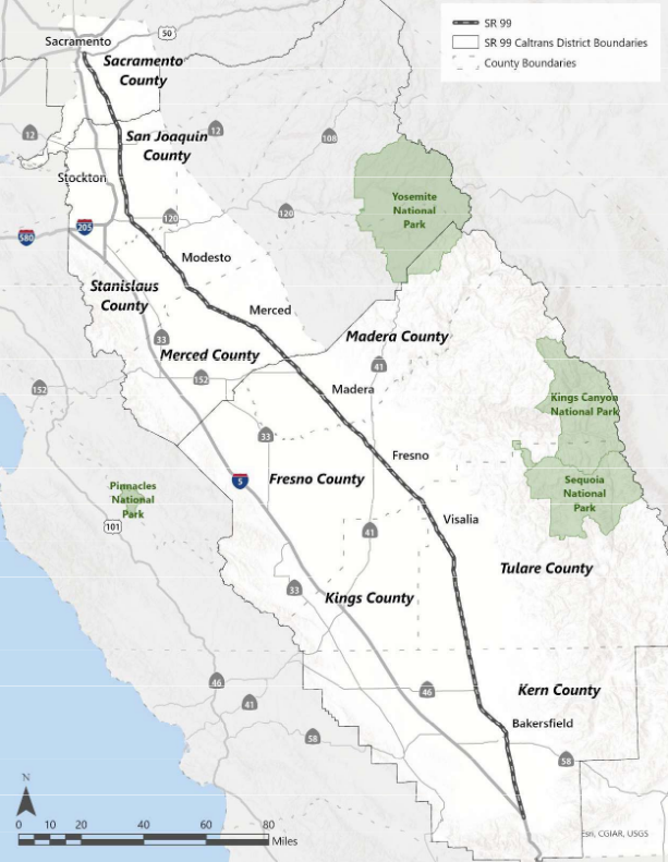 The SR 99 corridor runs between Bakersfield to the south and Sacramento to the north, spanning about 300 miles in Central and Northern California. Consistent with the Caltrans corridor planning process guide, the project team developed a Comprehensive Multimodal Corridor Plan (CMCP) for State Route 99 (SR 99) through the San Joaquin valley.